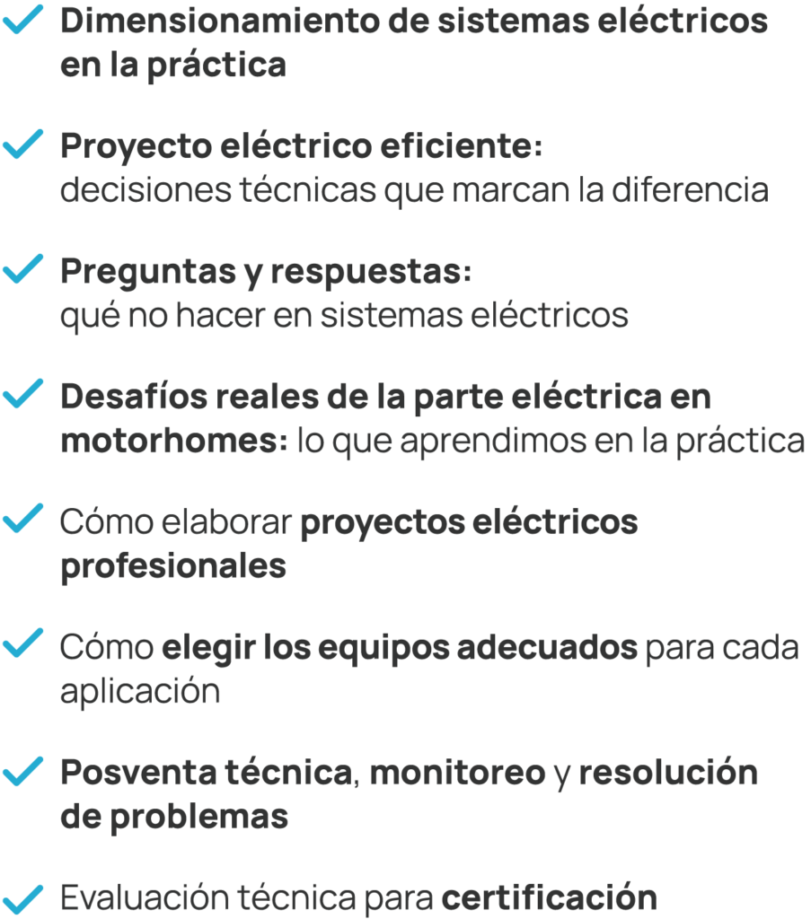 Con esta base, los contenidos del programa están estructurados a partir de los desafíos reales encontrados en sistemas eléctricos aplicados a motorhomes, embarcaciones y vehículos especiales. El alumno aprende a documentar proyectos de forma profesional y profundiza sus conocimientos en monitoreo, diagnóstico y soporte técnico de posventa, competencias esenciales para quienes desean destacarse y crecer de manera sostenible en el mercado. Al finalizar la formación, el alumno recibe la certificación Renogy, que valida su cualificación técnica y fortalece su credibilidad profesional.